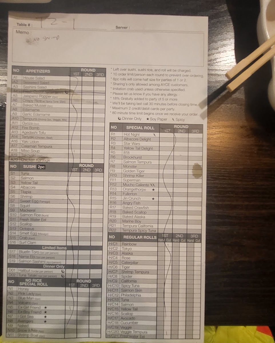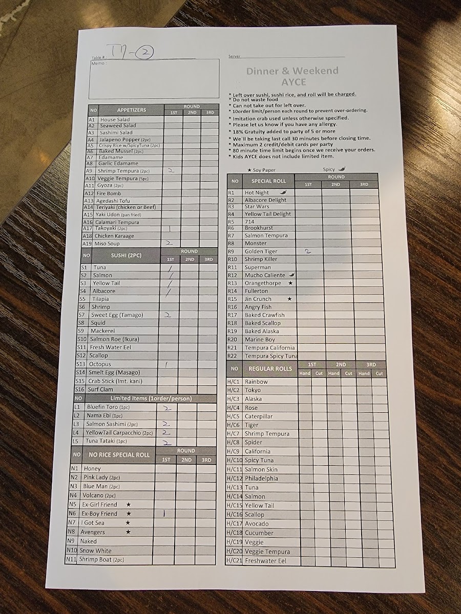 8 pieces. In: spicy tuna, cucumber. Out: avocado.